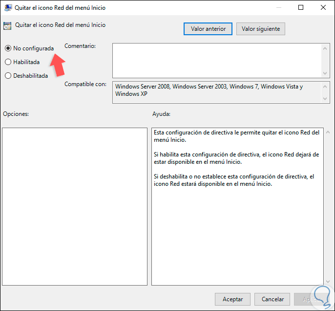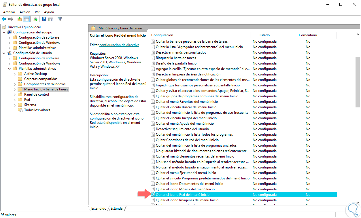 En el panel central ubicaremos la política llamada “Quitar el icono Red del menú Inicio”: