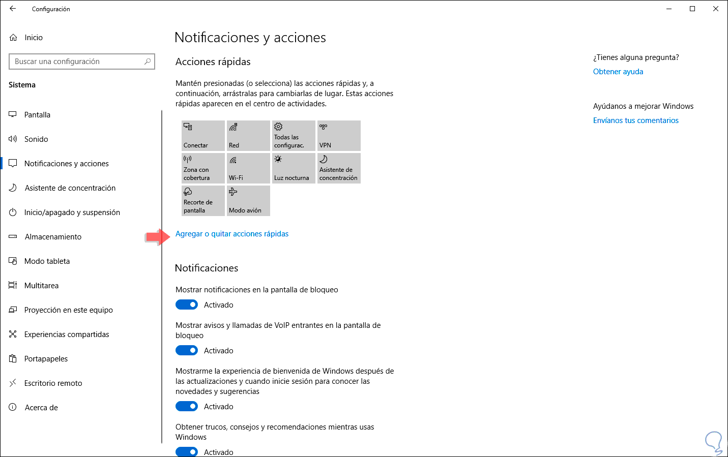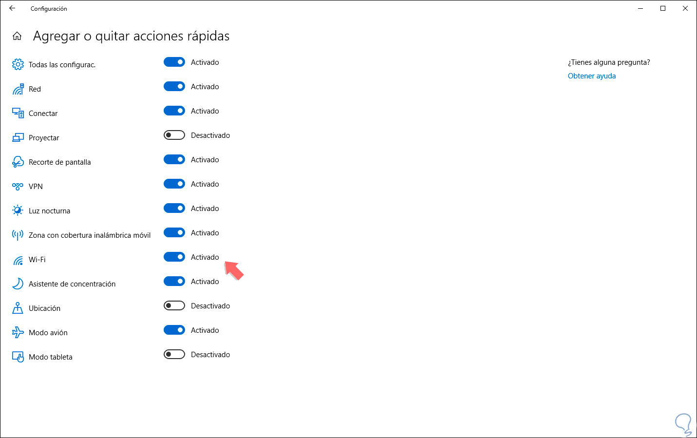 Allí daremos clic en la línea “Agregar o quitar acciones rápidas” y debemos validar que el interruptor de la opción Wi-Fi se encuentre activo. En caso de no ser así, debemos pulsarlo para su activación.
