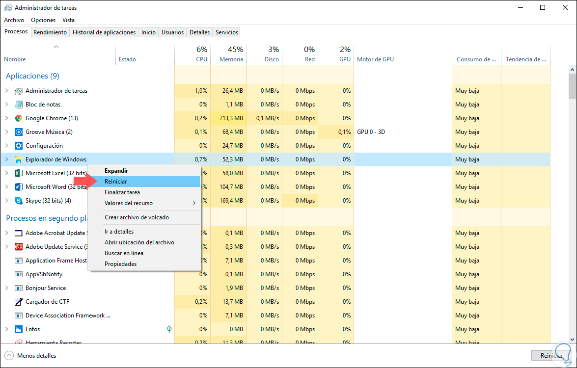 Una vez accedamos al administrador de tareas, vamos a la pestaña Procesos y allí ubicaremos el proceso llamado “Explorador de Windows”, damos clic derecho sobre el y disponemos de dos opciones que son: