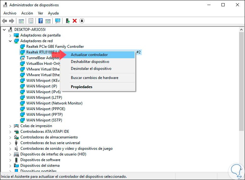 En la ventana que será desplegada vamos a la sección “Adaptadores de red” y allí damos clic derecho sobre el adaptador actual y seleccionamos la opción “Actualizar controlador”: