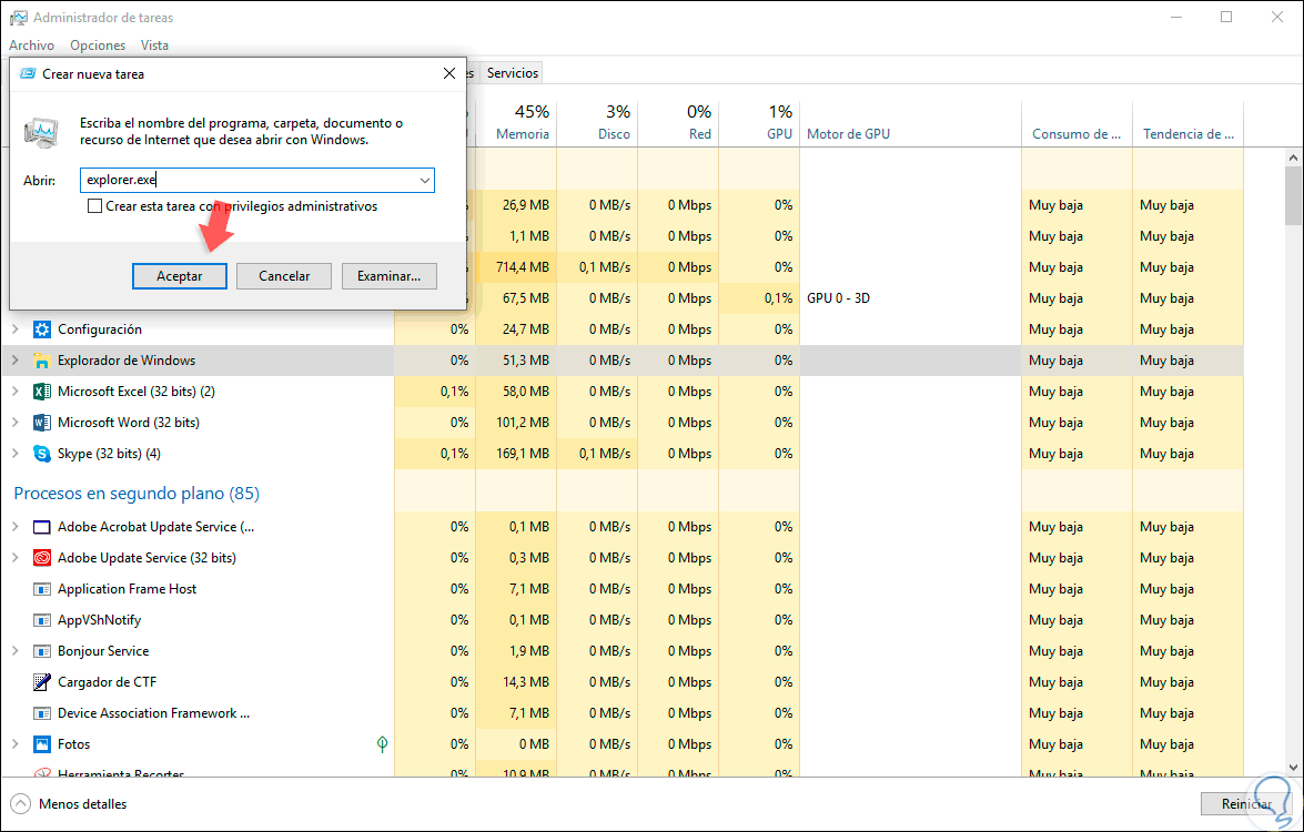 En la ventana emergente ejecutamos el comando “explorer.exe”. Pulsamos en aceptar y así reiniciaremos el proceso del explorador de Windows 10.