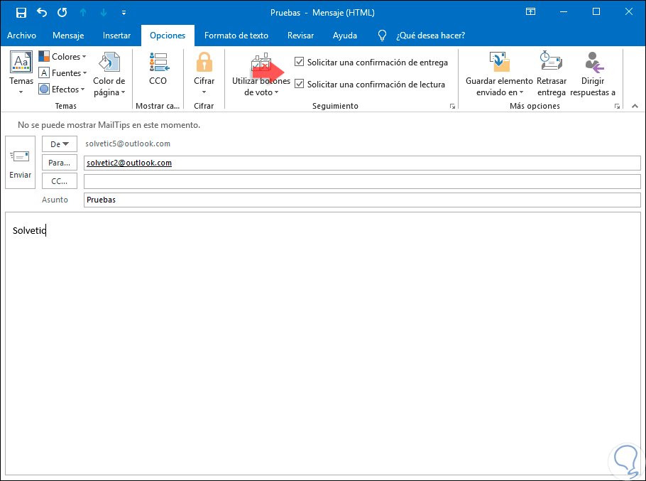 En caso de desear habilitar la confirmación para un solo usuario, debemos redactar el correo y en la ventana de nuevo correo ir al menú “Opciones” y allí en el grupo “Seguimiento” debemos activar las siguientes casillas: