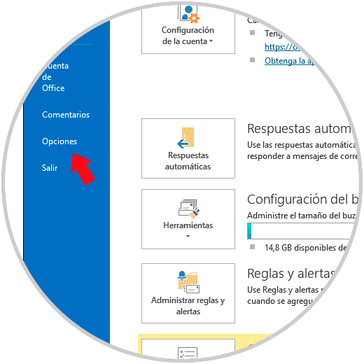 La primera posibilidad que Outlook nos ofrece es pedir la confirmación para todos los correos que enviamos sin importar el destinatario, si este es el objetivo debemos abrir Outlook e ir al menú “Archivo”, allí damos clic en “Opciones”: