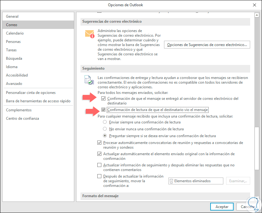 En la ventana que será desplegada vamos a la categoría Correo y allí ubicamos la sección “Seguimiento” donde activamos las siguientes casillas. Allí damos clic en Aceptar para confirmar los cambios.