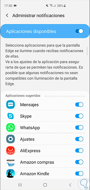 Ahora, se despliega una ventana emergente donde se encuentra la opción “Iluminación de pantalla Edge” para habilitarla desplazamos hacia la derecha el pequeño botón que se encuentra al lado de la alternativa.
