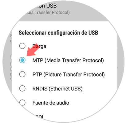 Posteriormente, podrás ver que aparecerá un menú de opciones emergente, en este mismo tienes que seleccionar “MTP (Media Transfer Protocol)”.