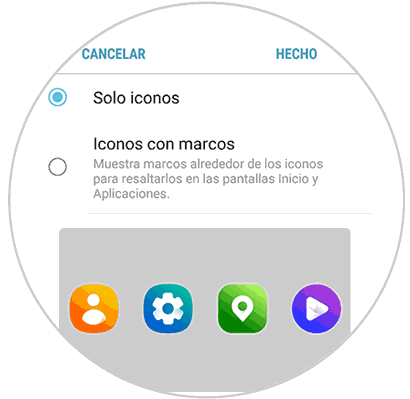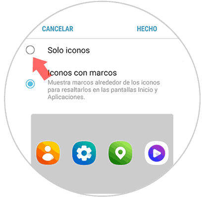 Para terminar, podrás ver que habrá dos casillas a escoger, entre las que se presentan “Solo iconos” e “Iconos con marcos”. Debes seleccionar la primera opción para lograr quitarle el fondo a las aplicaciones de tu sistema en el Samsung Galaxy M10.