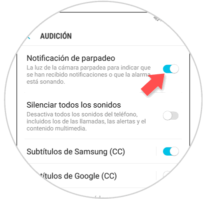 Una vez completado el paso anterior se desplegará un menú con cuatro alternativas, entre ellas se encuentra “Notificación de parpadeo” desplazamos hacia la derecha el botón que se encuentra al lado de la opción. De manera inmediata se habilitará la luz de notificación en el equipo.