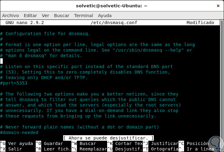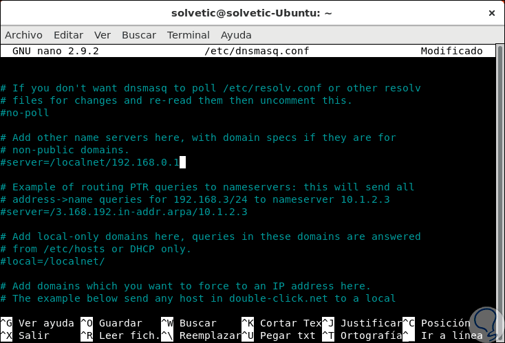 Una vez instalada esta utilidad, accederemos al archivo de configuración dnsmasq ejecutando la siguiente línea:
