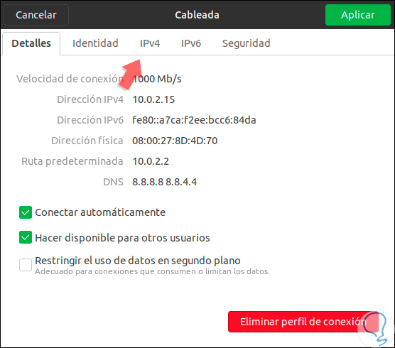 Para proceder con el cambio del servidor DNS iremos a la pestaña “Ipv4” donde veremos lo siguiente: