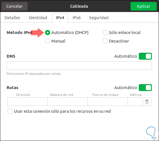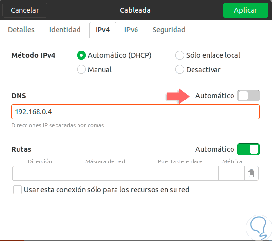 Como podemos observar, el método por defecto es “Automático (DHCP)”, es decir, la dirección del servidor DNS está siendo tomada directamente por la configuración del ISP, para cambiar el DNS de Ubuntu debemos pulsar en el interruptor “Automático” en la sección DNS y allí ingresar la dirección deseada: