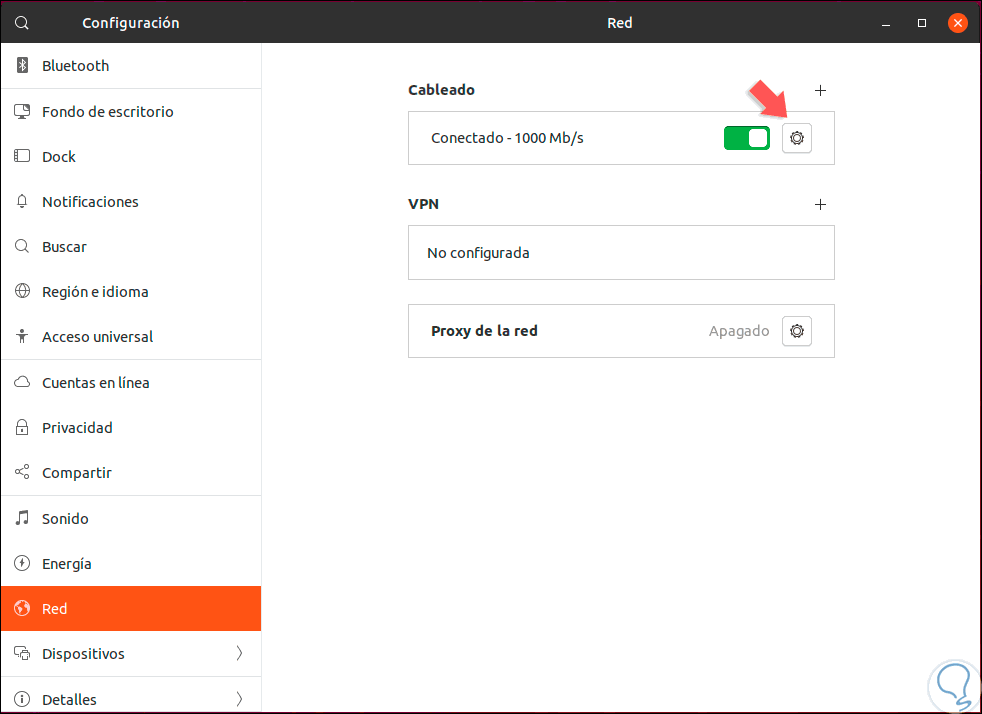 Damos clic allí para acceder a los parámetros de configuración de la red disponible en Ubuntu sea cableada o inalámbrica: