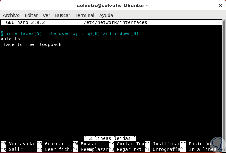 Otra de las opciones disponibles a través de la terminal es acceder al archivo de las interfaces de red, para ello ejecutamos lo siguiente: