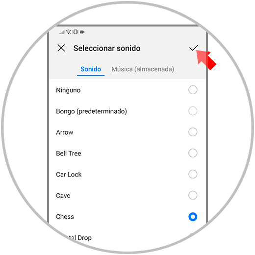 A continuación, debes seleccionar cual es la melodía que deseas establecer. Esto lo puedes realizar desde los sonidos que se encuentran predeterminados y ya instalados en el sistema, o igualmente los puedes descargar y almacenar en el teléfono de forma alterna. Para finalizar solo debes pulsar el cuadro que está en la derecha del nombre del sonido que elegiste y listo.