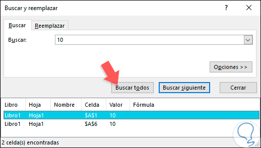 Daremos clic en el botón “Buscar todos” y en la parte inferior encontremos la fila en la cual está el valor buscado: