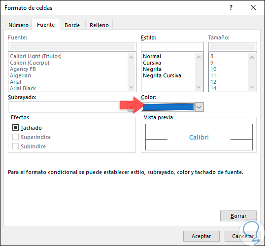 En este caso hemos determinado que el formato será aplicado si el valor en la celda es igual a 100, ahora, para asignar el color de la celda damos clic en el botón “Formato” y en la pestaña “Fuente” y en el campo “Color” asignaremos el color deseado a aplicar en la celda que cumpla esa condición: