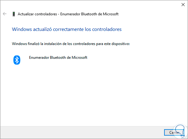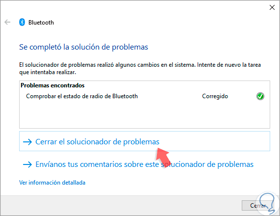 De forma automática Windows 10 corregirá los fallos que estén asociadas al Bluetooth impidiendo su correcto funcionamiento. Pulsamos en Cerrar para salir del asistente.
