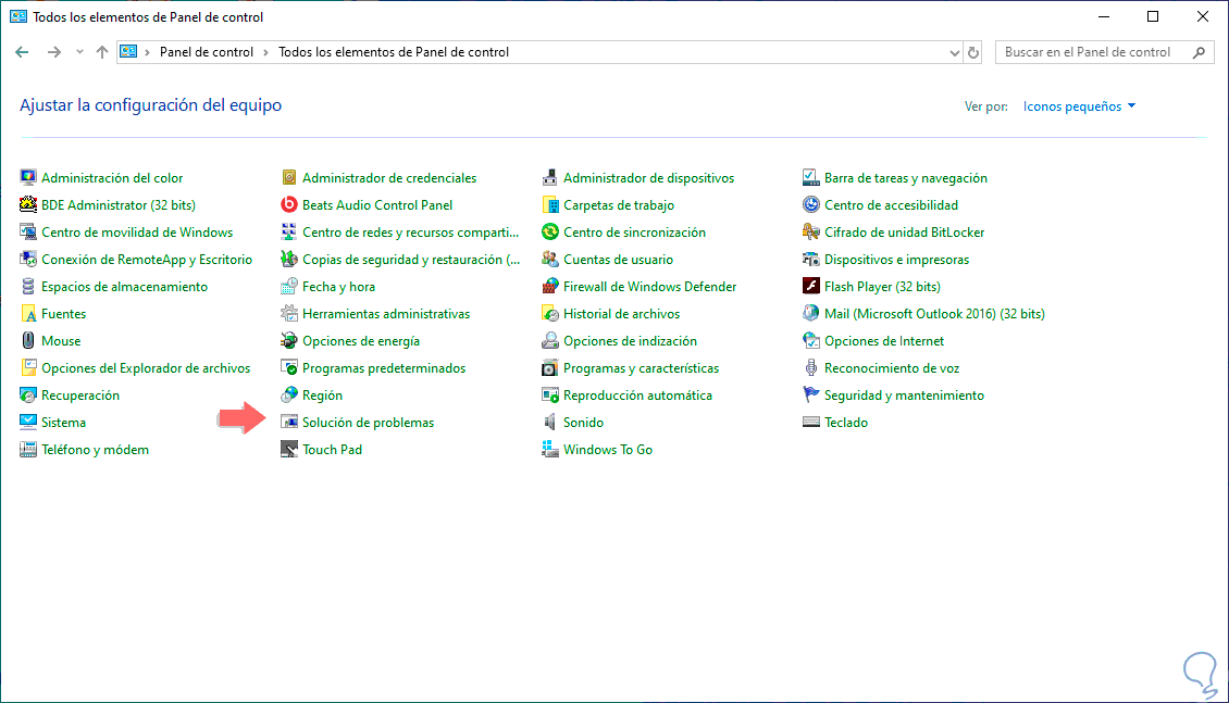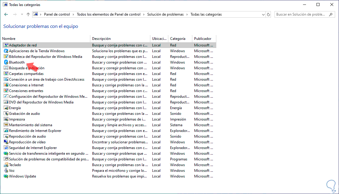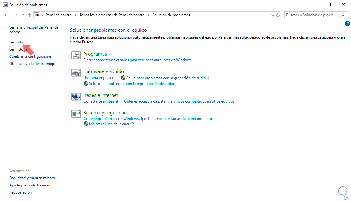 Allí seleccionamos la línea “Solución de problemas” y en la nueva ventana desplegada damos clic en la opción “Ver todo” ubicada en el costado lateral izquierdo: