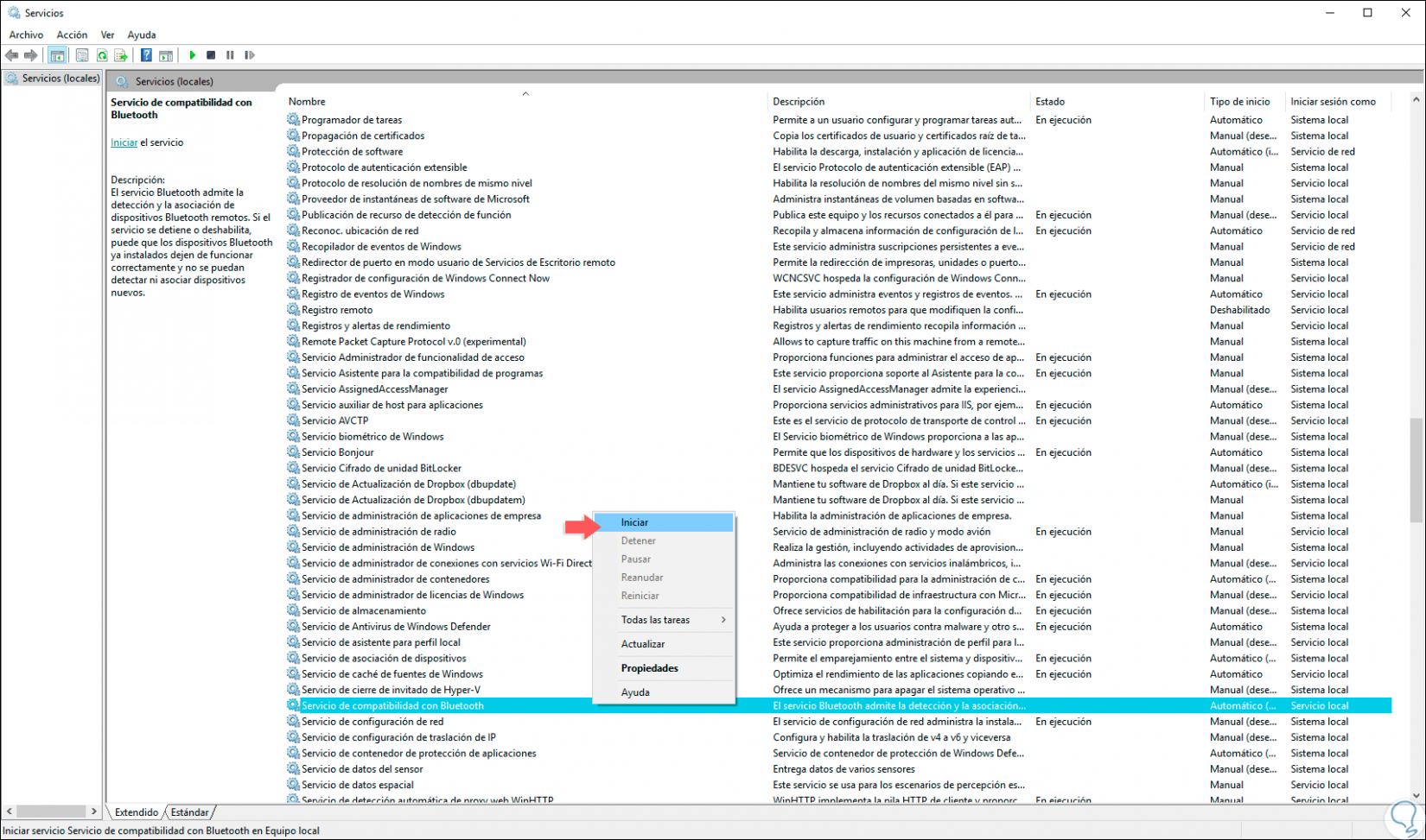 2. Comprobar el servicio de Bluetooth en Windows 10