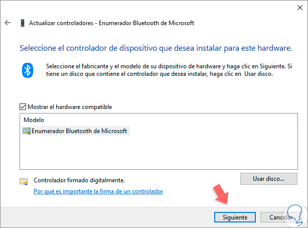 Damos clic en Siguiente y se dará inicio al proceso de instalación del controlador en Windows 10: