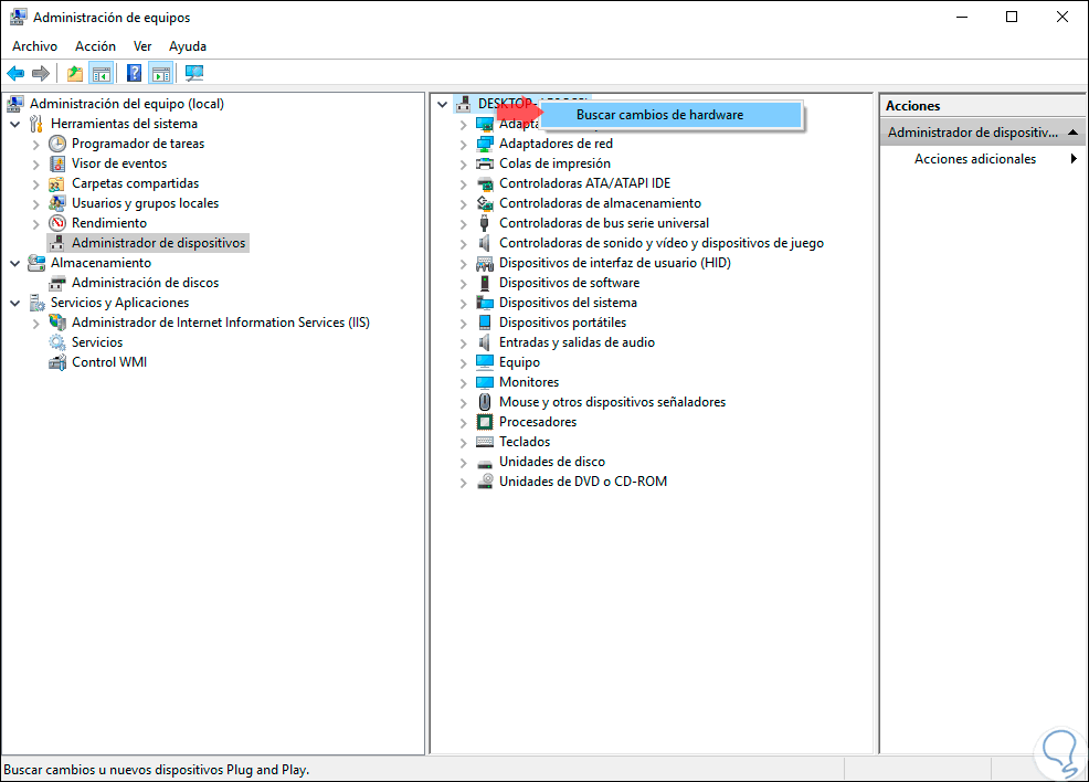 En la ventana desplegada, en la sección Herramientas, damos clic sobre la línea “Administrador de dispositivos” y allí daremos clic derecho sobre el nombre de nuestro equipo y seleccionamos la opción “Buscar cambios de hardware”: