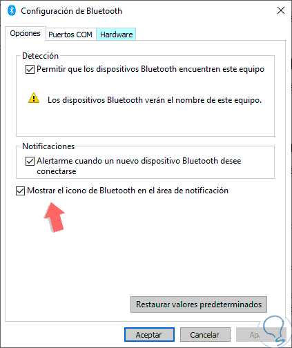 Allí daremos clic en la línea “Más opciones de Bluetooth” y en la nueva ventana que se desplegará confirmamos que la casilla “Mostrar el icono de Bluetooth en el área de notificación” esté activo:
