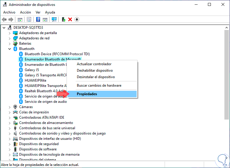 Una vez allí, ubicaremos la línea Bluetooth, la expandimos y damos clic derecho sobre el dispositivo usado y seleccionamos la opción Propiedades: