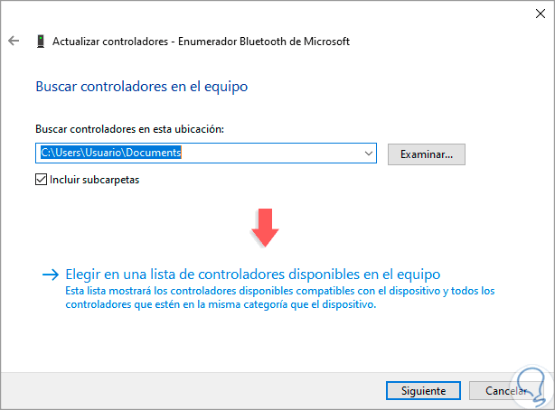 Allí elegimos la opción “Elegir en una lista de controladores disponibles en el equipo” y será desplegado lo siguiente: