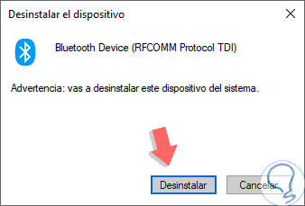 Se desplegará la siguiente advertencia. Allí confirmamos la acción dando clic en el botón Desinstalar, reiniciamos el sistema y automáticamente Windows 10 cargará los controladores necesarios para el Bluetooth.