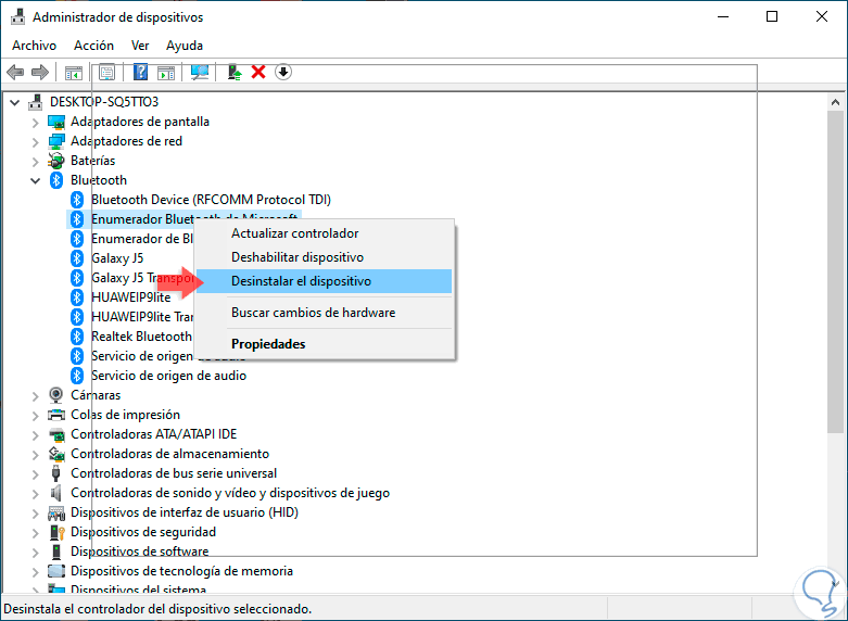 Otra de las opciones disponibles consiste en desinstalar el dispositivo Bluetooth para que Windows 10 lo instale en el próximo inicio de sesión, para esto vamos al Administrador de dispositivos y allí damos clic derecho sobre el dispositivo Bluetooth actual y seleccionamos la opción “Desinstalar dispositivo”: