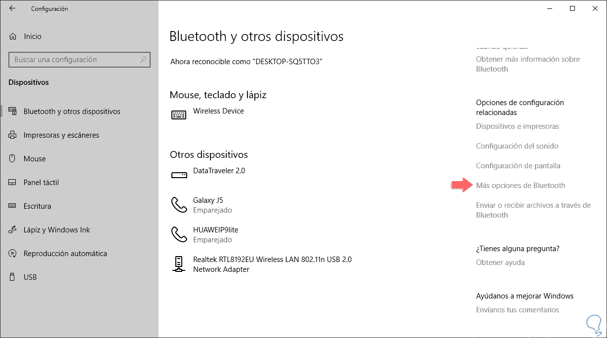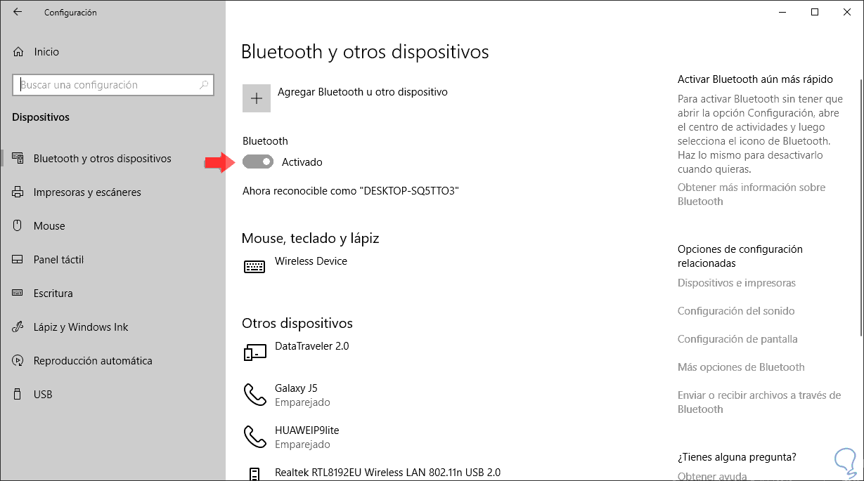 3. Comprobar Bluetooth desde la Configuración en Windows 10