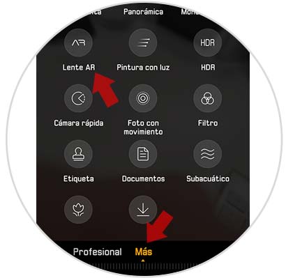 Una vez dentro de la cámara, debes desplazarte en la parte inferior hasta la opción de “Mas”. Dentro de este apartado, selecciona el icono que pone “Lente AR”
