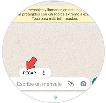Lo siguiente que debes hacer es entrar en WhatsApp en el chat en el que quieres compartir el vídeo. Ahora ponte en la barra de mensajes y pulsa sobre ella la opción de pegar.