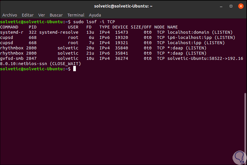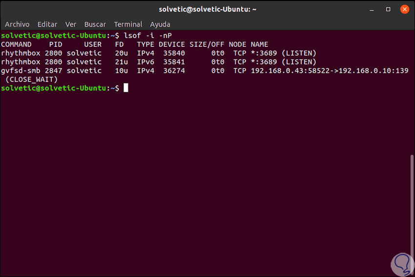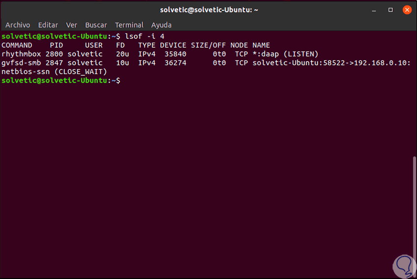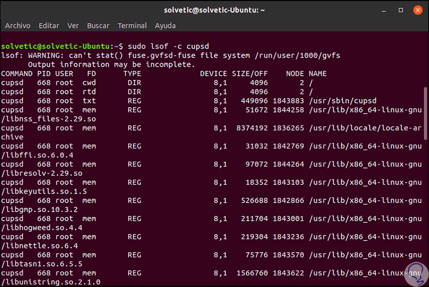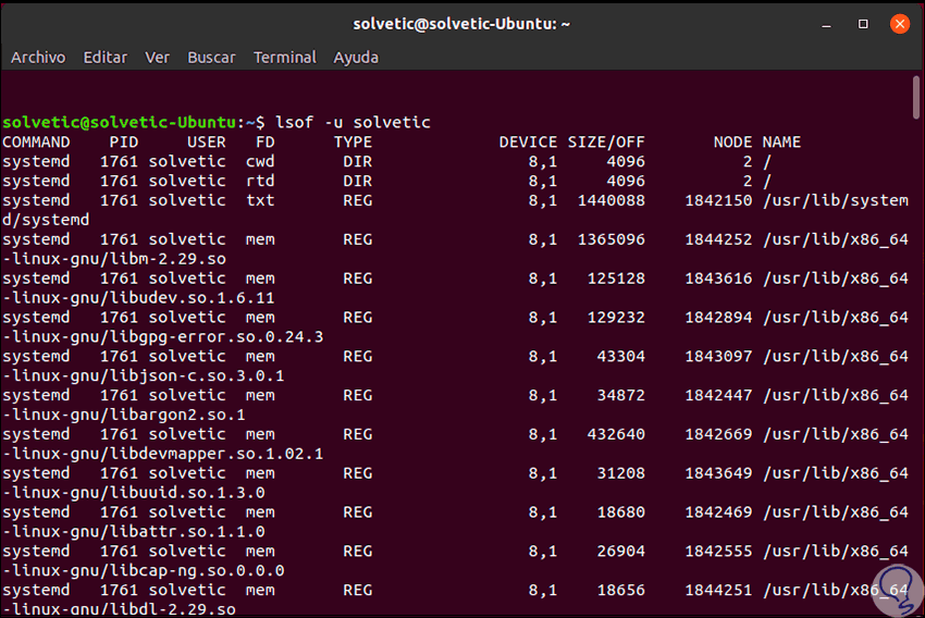 lsof -u SolveticComo resultado encontramos detalles mucho más completos sobre dicho usuario en particular: