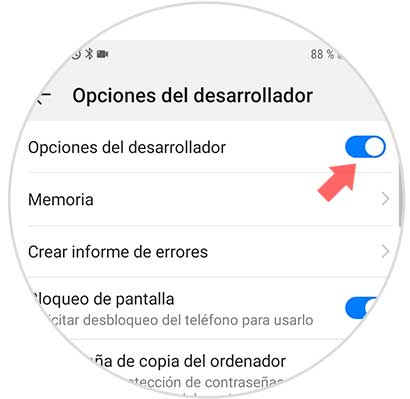 Ahora procederás a aparecer en una nueva ventana, y aquí se encontrara de primera una alternativa que dice “Opciones del desarrollador” con una barra al lado, esta tienes que desplazarla al lado izquierdo de tu móvil para continuar.