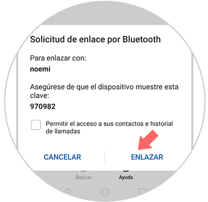 Posteriormente, se muestra un mensaje de carácter informativo en el cual se indica la clave que se requiere para interconectar ambos dispositivos mediante la tecnología bluetooth. Ahora solo debemos presionar sobre la sección “Enlazar” esta puede observarse en la parte inferior derecha de la pantalla de los dispositivos que se planea emparejar.