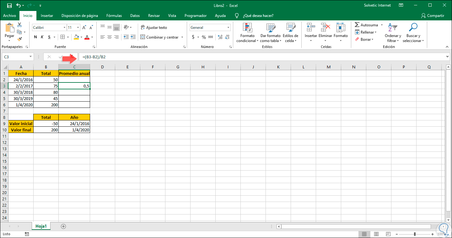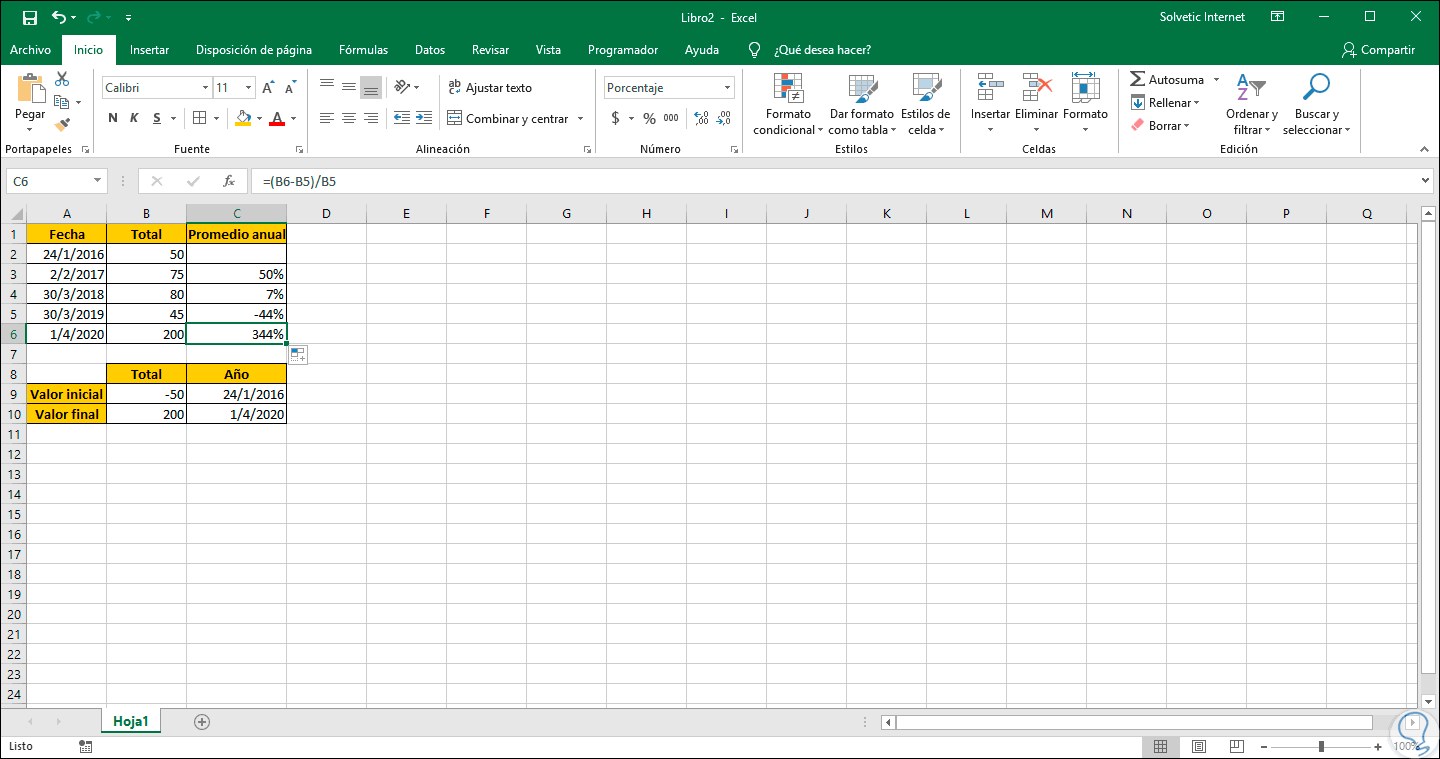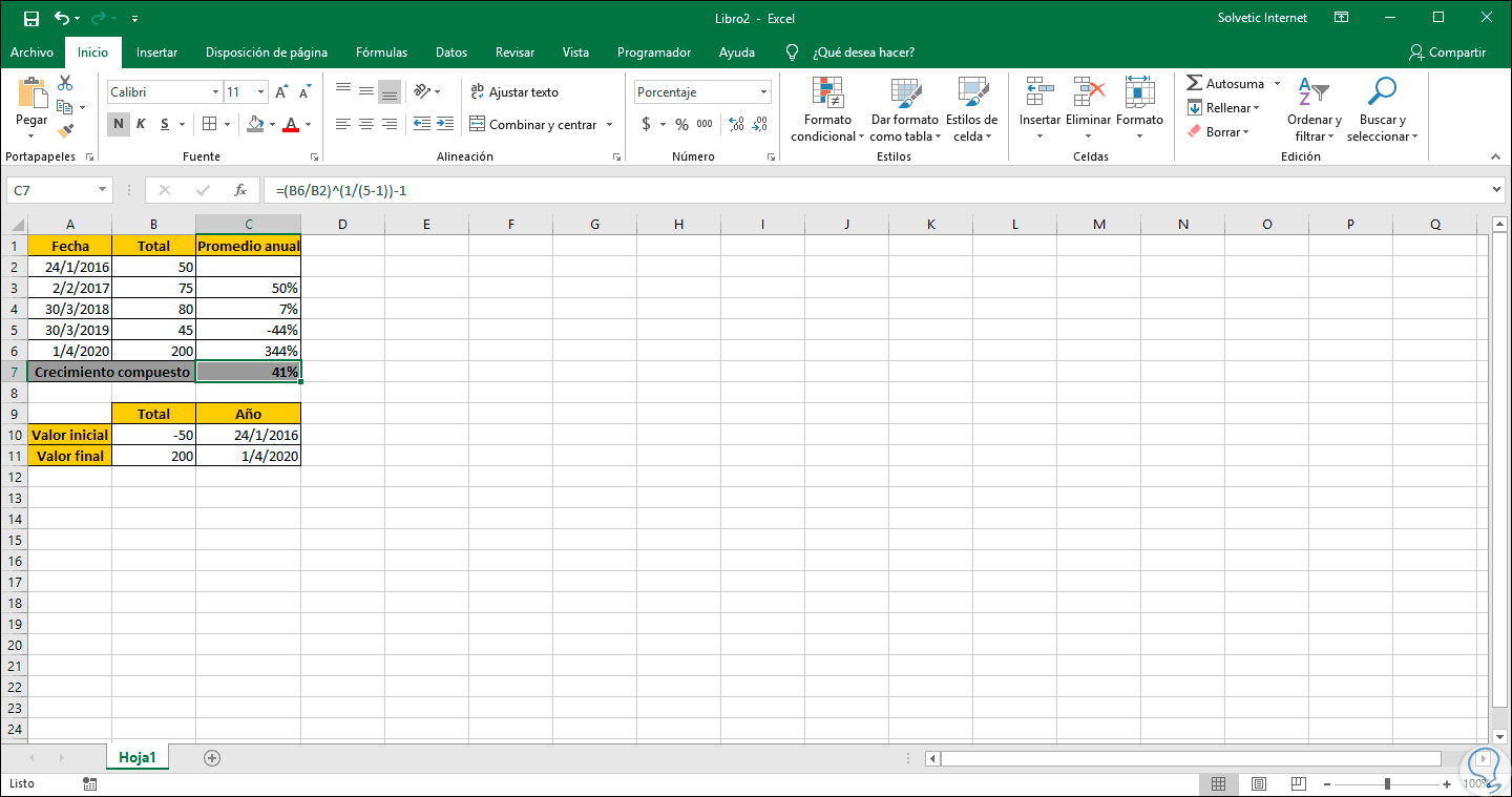 Este es otro método para calcular el porcentaje de crecimiento ya que se realiza de forma anual, es decir, cada año, podemos calcular las tasas de cada año registrado tomando los criterios “Valor Final - Valor Inicial / Valor Inicial”, en nuestro ejemplo usaremos la siguiente fórmula: