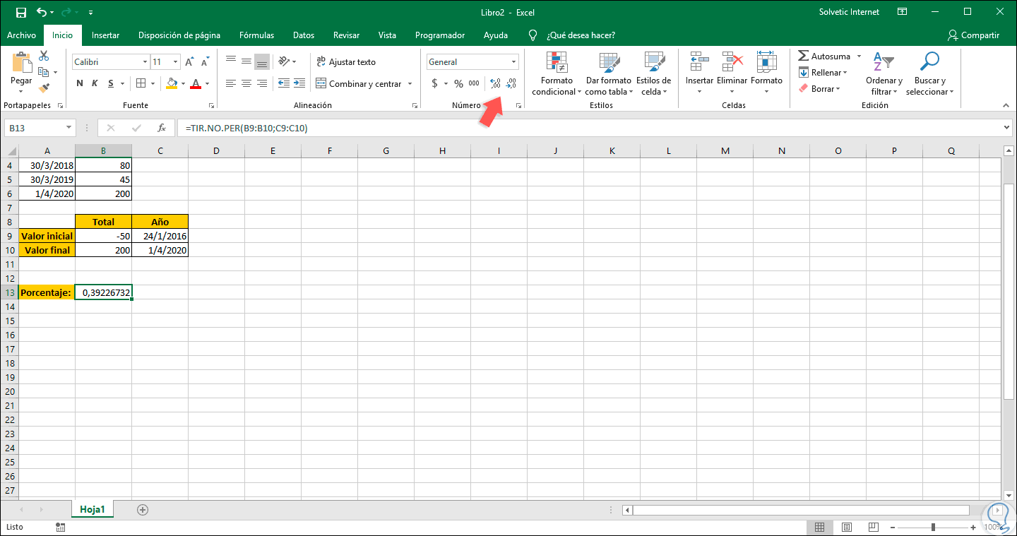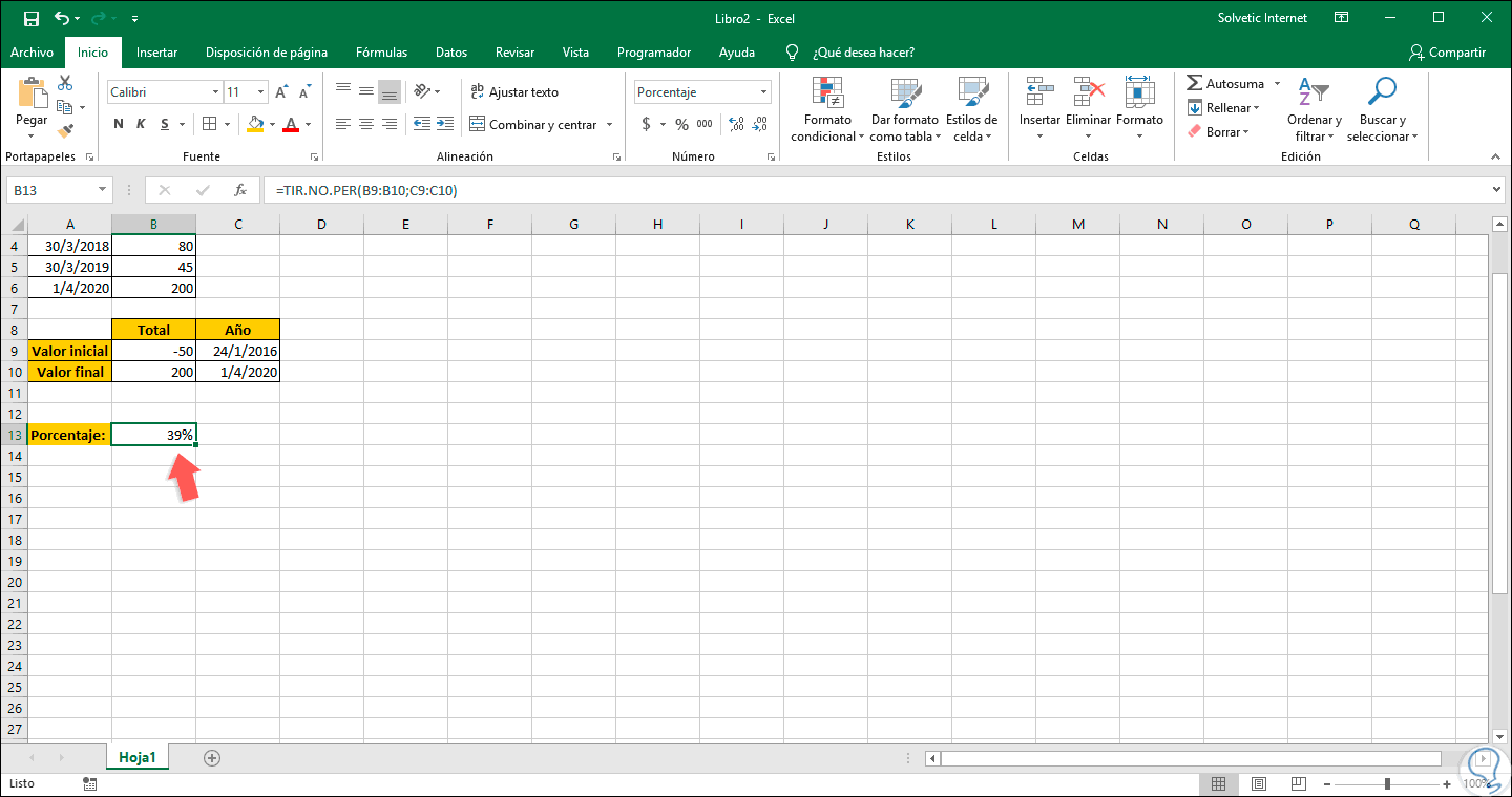 1. Cómo calcular porcentaje de la tasa de crecimiento en Excel 2019 usando la función TIR.NO.PER