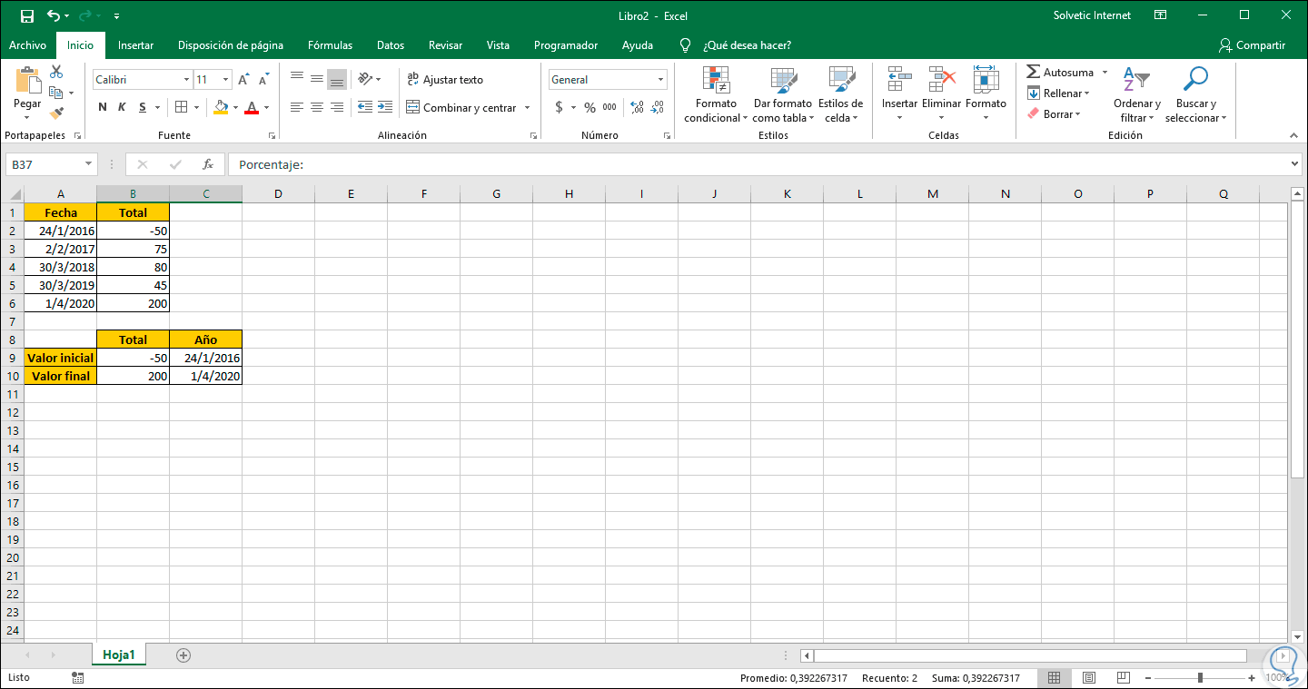 Allí usaremos los valores iniciales así como el rango de fechas inicial y final. Como resultado obtendremos lo siguiente: