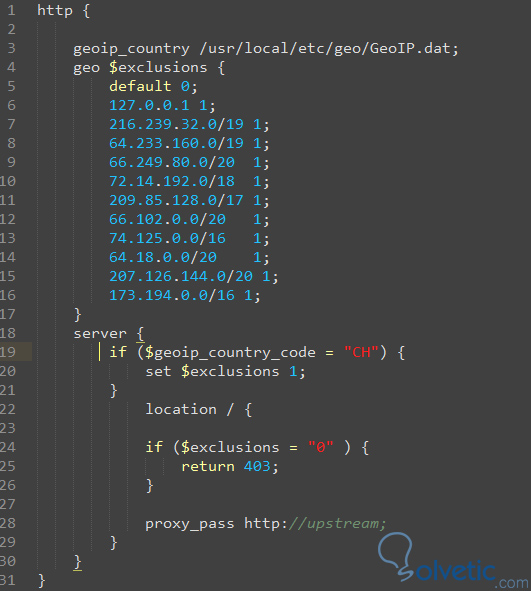 Además del módulo GeoIP, también podemos utilizar en conjunto el módulo geo que nos permite establecer una interfaz básica para asociar variables basadas en las direcciones IP de las conexiones con los clientes.