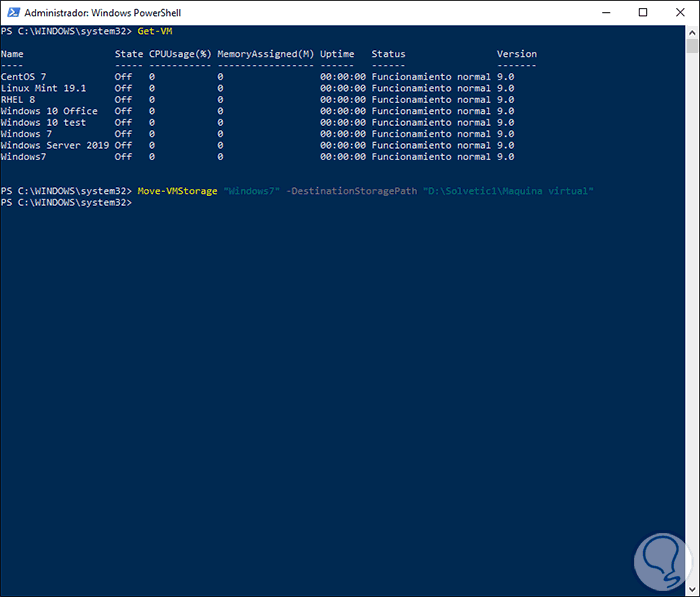 Move-VMStorage "Windows7" -DestinationStoragePath "D:\Solvetic1\Maquina virtual"
