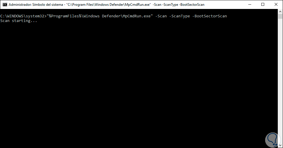 Otra de las grandes ventajas de usar Windows Defender a través de la línea de comandos es la posibilidad de activar un análisis para el sector de inicio del sistema con el fin de detectar cualquier vulnerabilidad, en caso de detectarse algo allí sería un problema realmente crítico ya que estamos hablando del sector fundamental del disco duro, para activar el escaneo en el sector de inicio del disco duro vamos a ejecutar la siguiente orden en el símbolo del sistema.