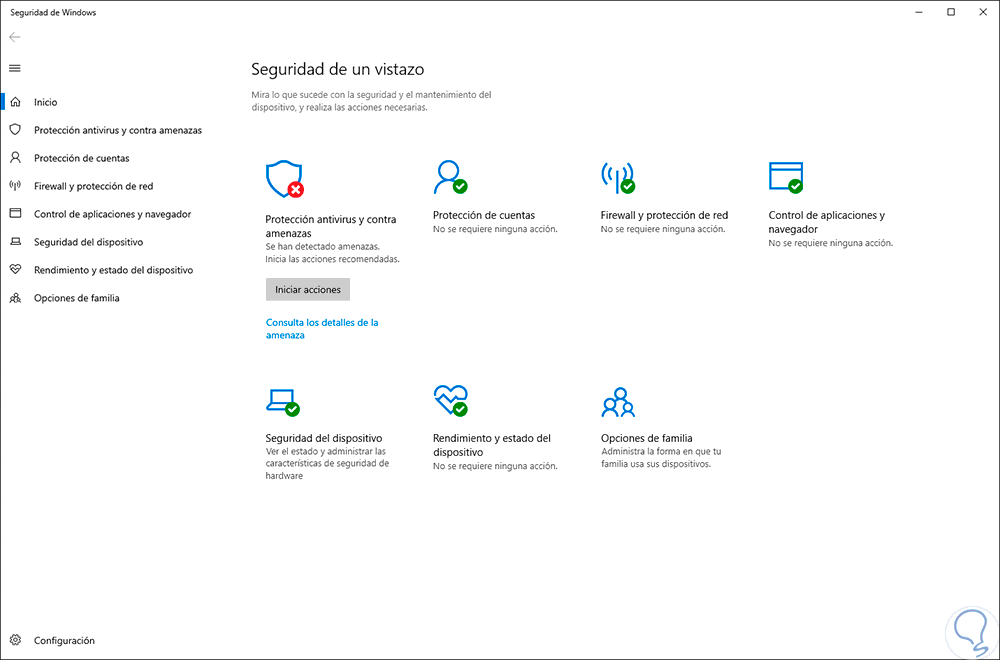 Cuando accedemos a la consola del Centro de Seguridad de Windows Defender veremos lo siguiente: