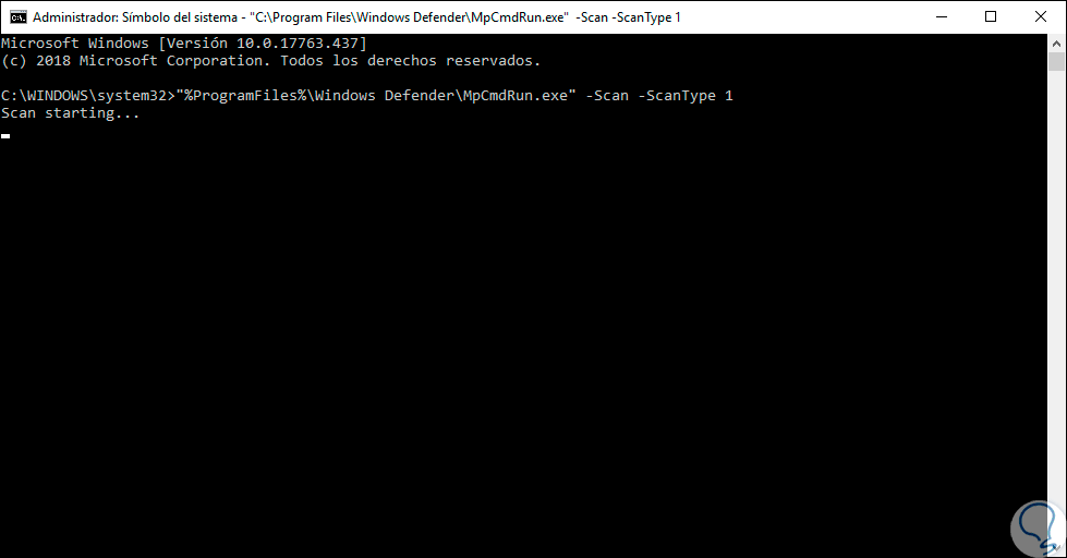 "%ProgramFiles%\Windows Defender\MpCmdRun.exe" -Scan -ScanType 2En primer lugar veremos que se da inicio al proceso de escaneo: