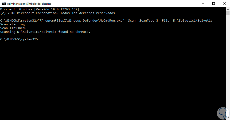 "%ProgramFiles%\Windows Defender\MpCmdRun.exe" -Scan -ScanType 3 -File D:\Solvetic1\Solvetic