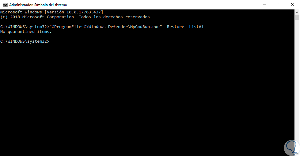 En el momento en que Windows Defender detecte una amenaza, este la moverá a la cuarentena con el fin de que no infecte el sistema operativo. Pero es posible que en algún momento se detecte algún archivo como amenaza cuando esta no lo es en realidad, por ello será necesario recuperar ese elemento para que no se vea afectado, para esto debemos listar todos los archivos en cuarentena con el siguiente comando: