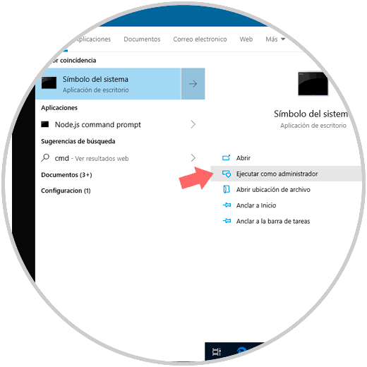 Para lograr nuestro objetivo debemos acceder como administradores al símbolo del sistema, para ello ingresamos “cmd” en el cuadro de búsqueda de Windows 10 y en la opción desplegada damos clic en la línea “Ejecutar como administrador”. Aceptamos el mensaje UAC y accederemos a la consola como administradores.