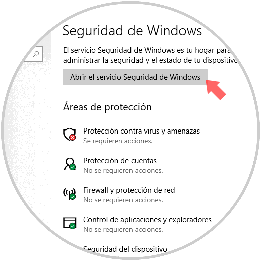Veremos lo siguiente. Allí damos clic en el botón “Abrir el servicio Seguridad de Windows” y de este modo iremos al centro de seguridad de Windows Defender.
