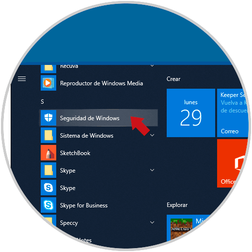 Para abrir Windows Defender desde el menú Inicio, damos clic en el botón de Inicio y en el panel lateral iremos a la letra S y seleccionamos Seguridad de Windows. Al seleccionar allí iremos a la consola de Windows Defender.