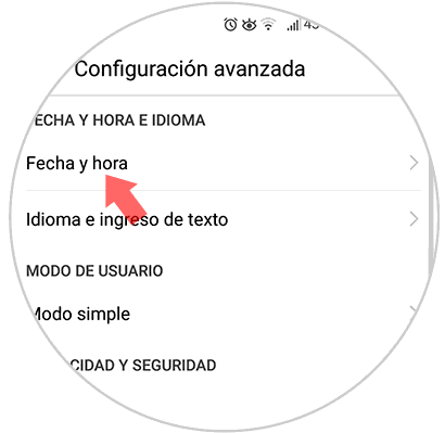Pulsamos allí y posteriormente encontramos la línea "Fecha y hora"